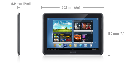 Aunque su nombre sea Note, nosotros vemos Tab en el diseño, ya que es estéticamente igual a sus hermanos (marco cromado y altavoces laterales) y en cuanto al peso y las dimensiones más de lo mismo (262 x 180 x 8,9 mm y 600 gramos para el Galaxy Note 10.1; y 256.7 x 175.3 x 9.7 mm y 581 para el Galaxy Tab 2 10.1).