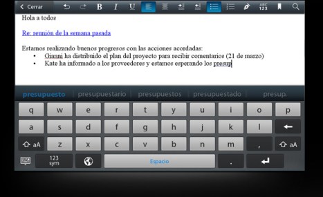 La creación de correos electrónicos nuevos también está muy lograda. Tenemos la opción de formatear el texto a nuestro gusto y adjuntar archivos es tan sencillo como elegir con el dedo todos los documentos, imágenes o archivos que queremos enviar desde una sola pantalla del administrador de archivos.
